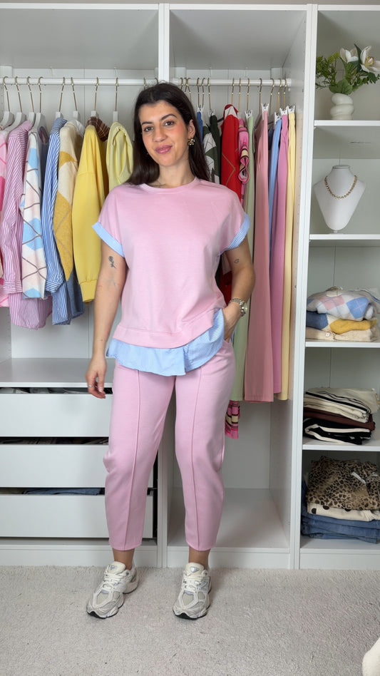 Conjunto fato de treino com pormenor de camisa as riscas