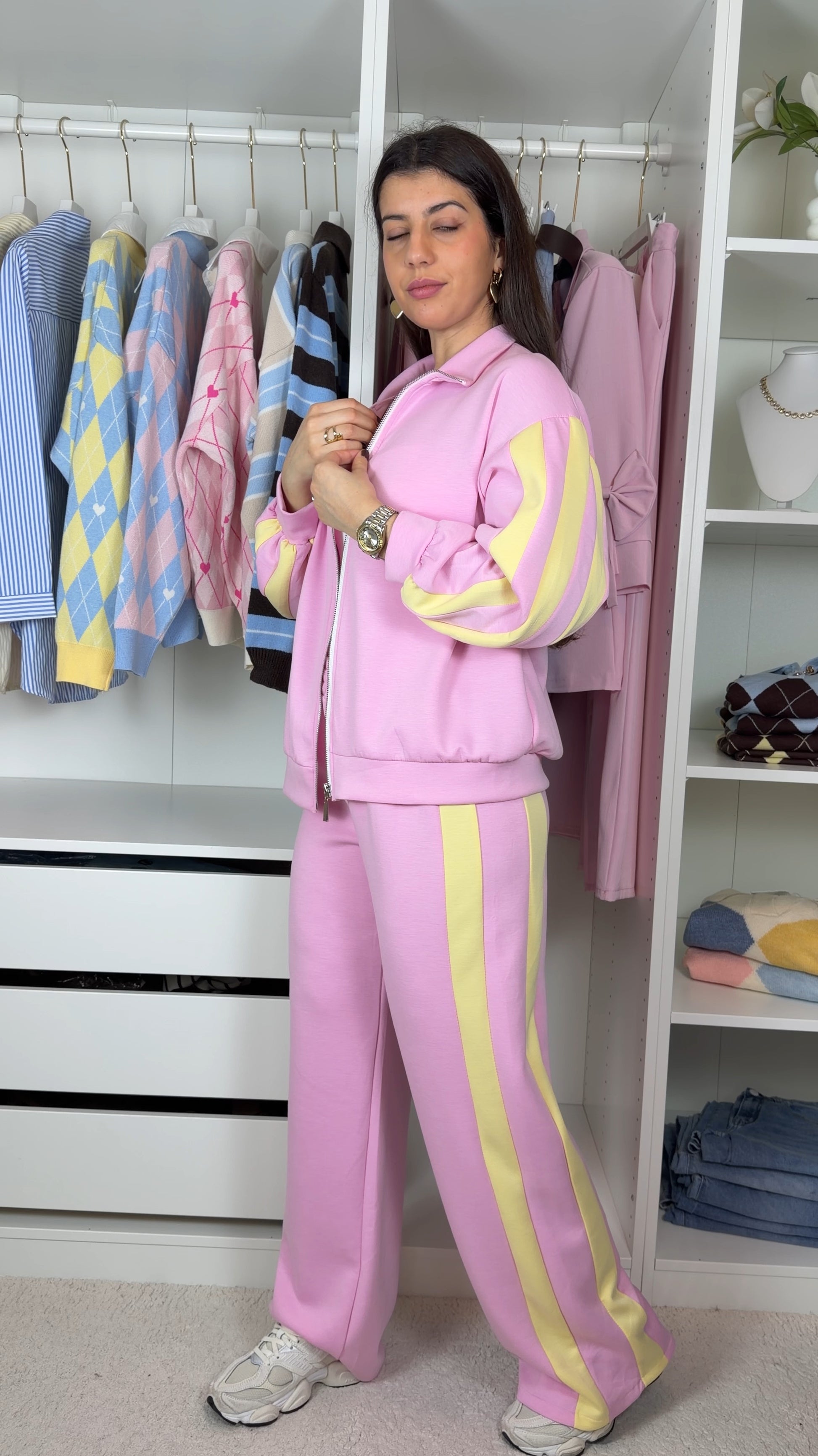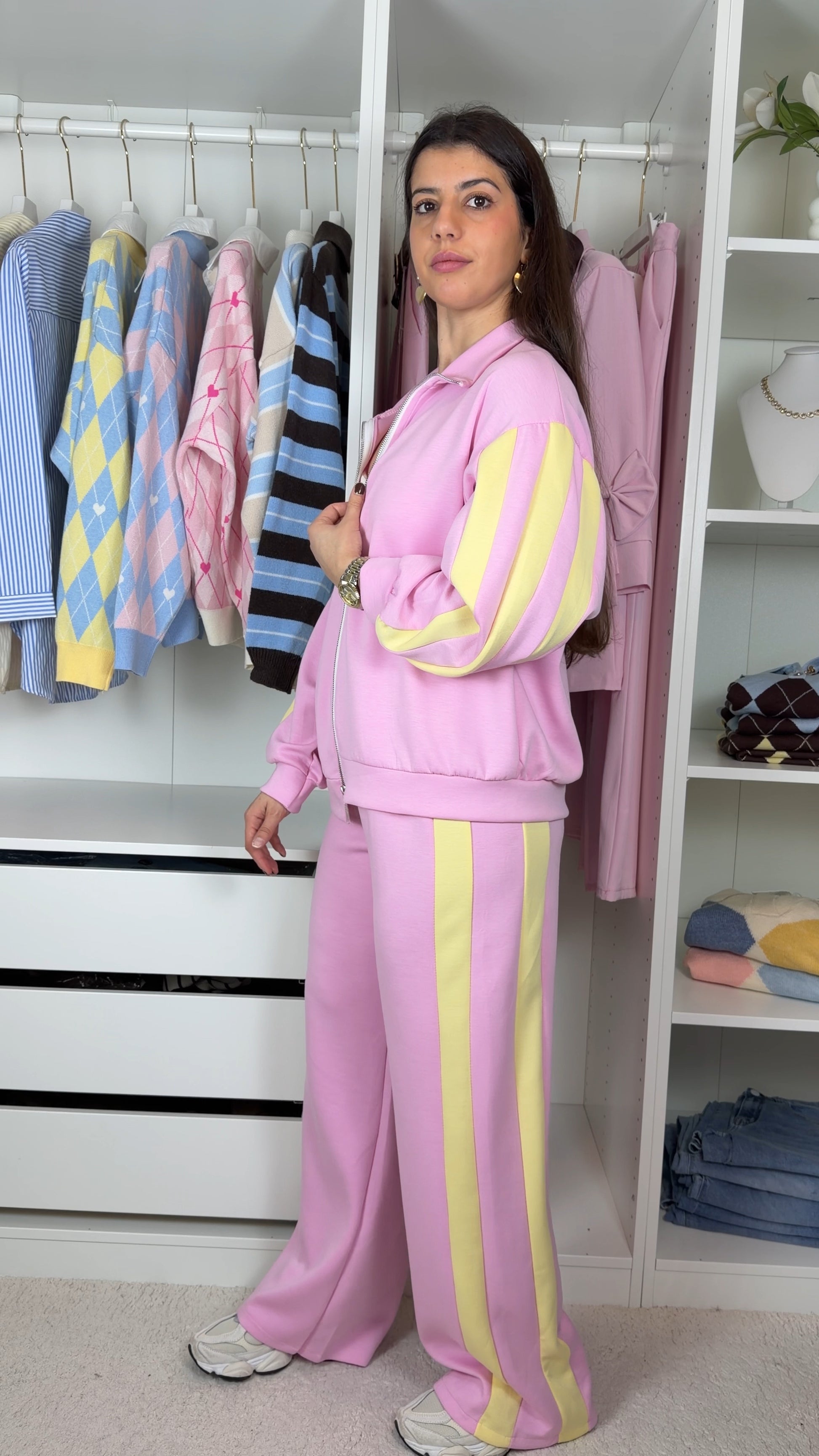 Conjunto fato de treino com pormenor de camisa as riscas