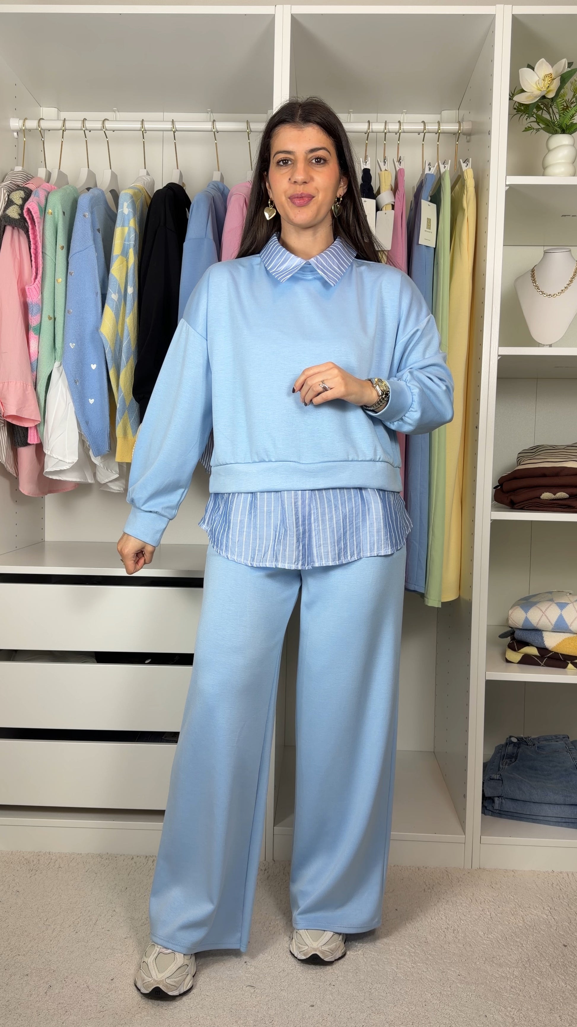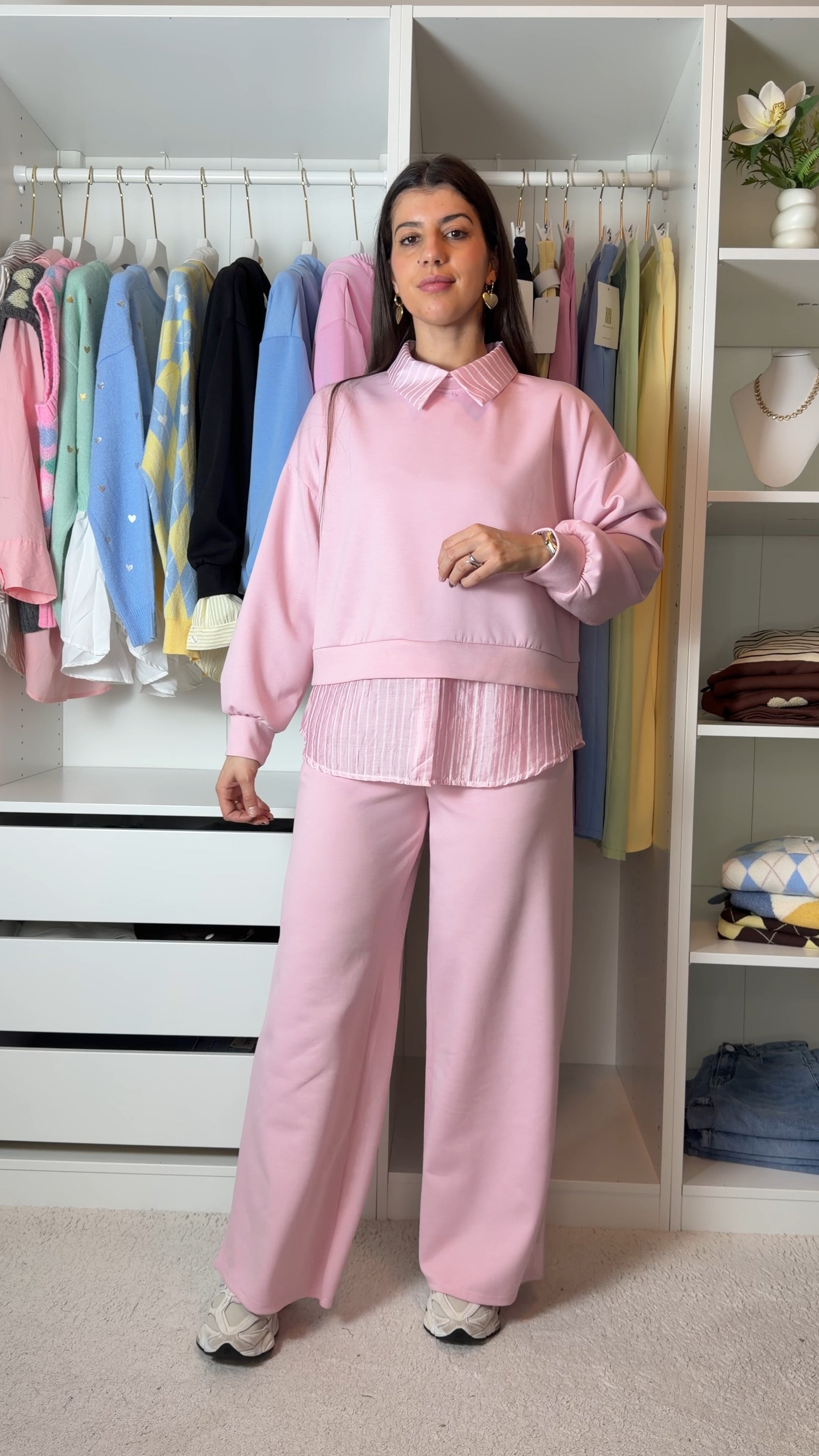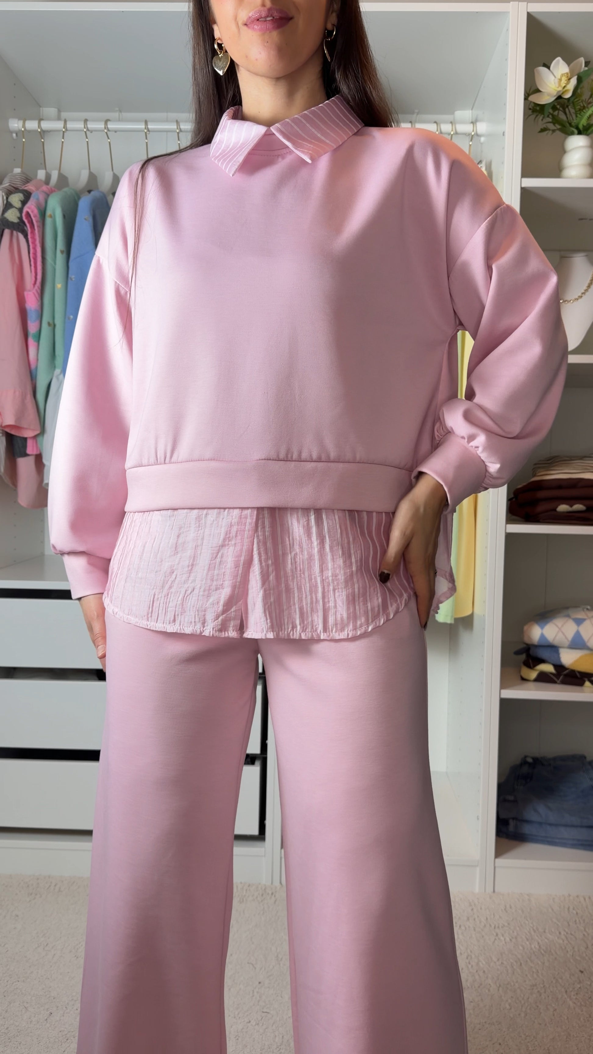 Conjunto fato de treino com pormenor de camisa as riscas