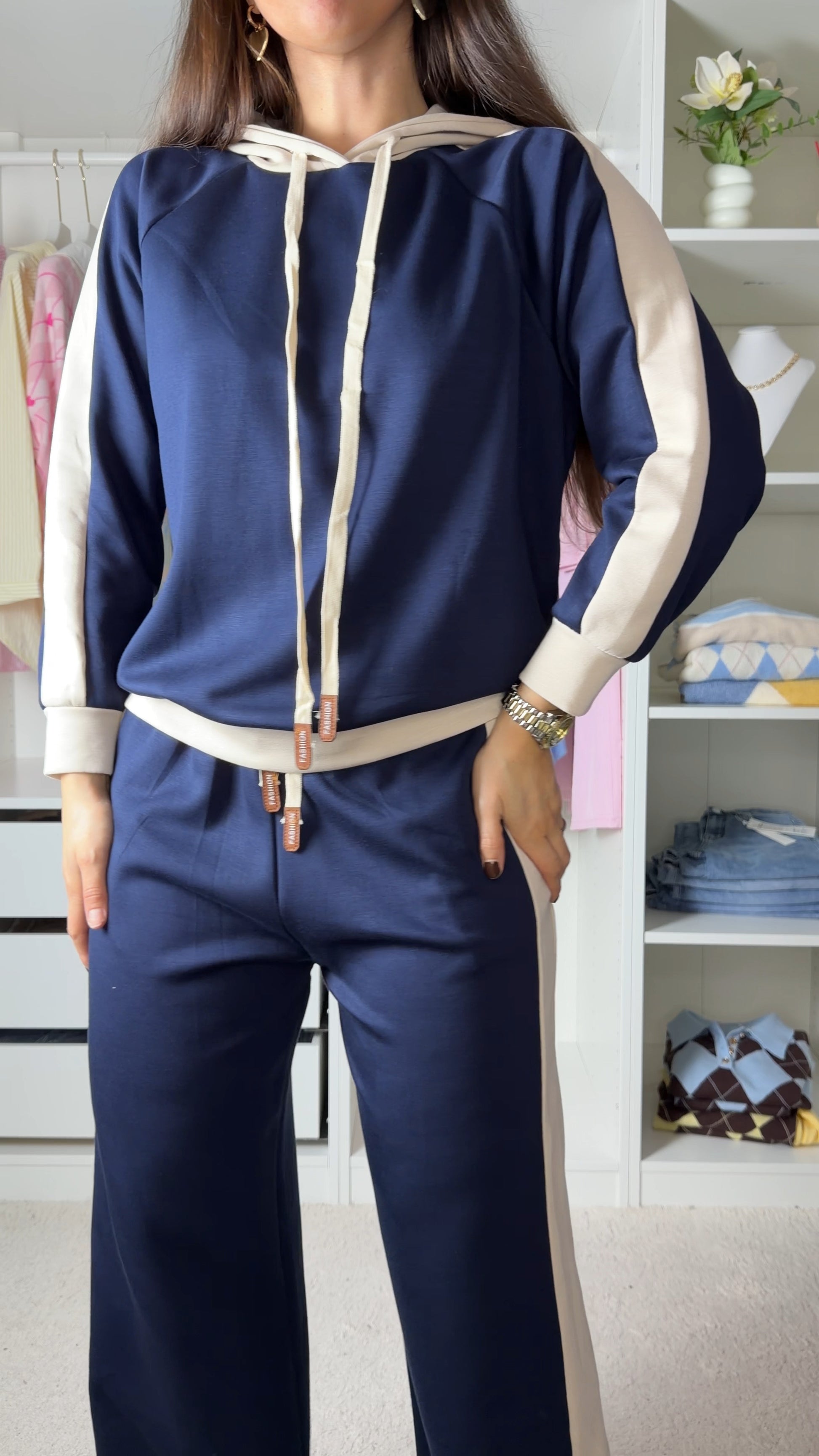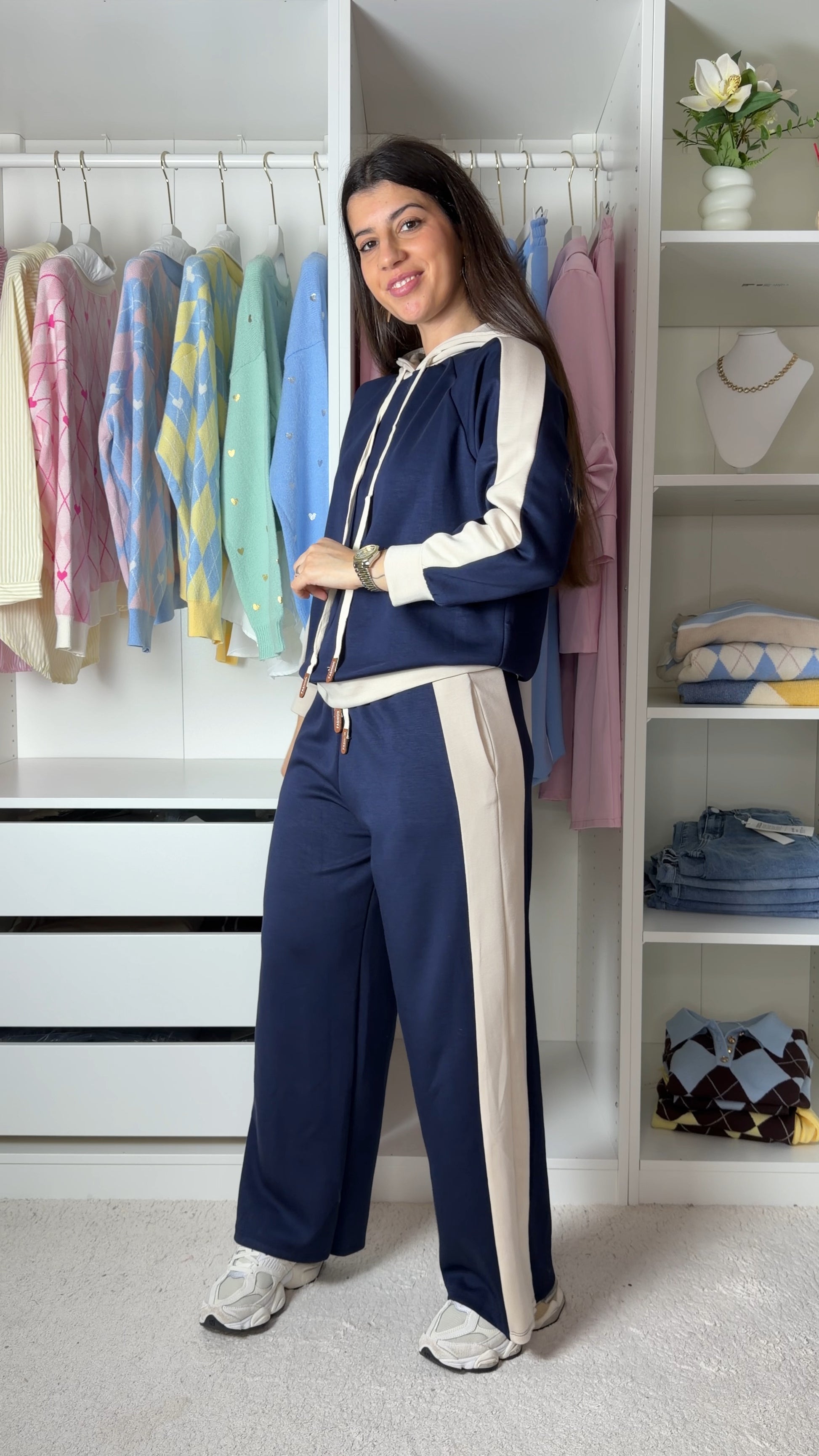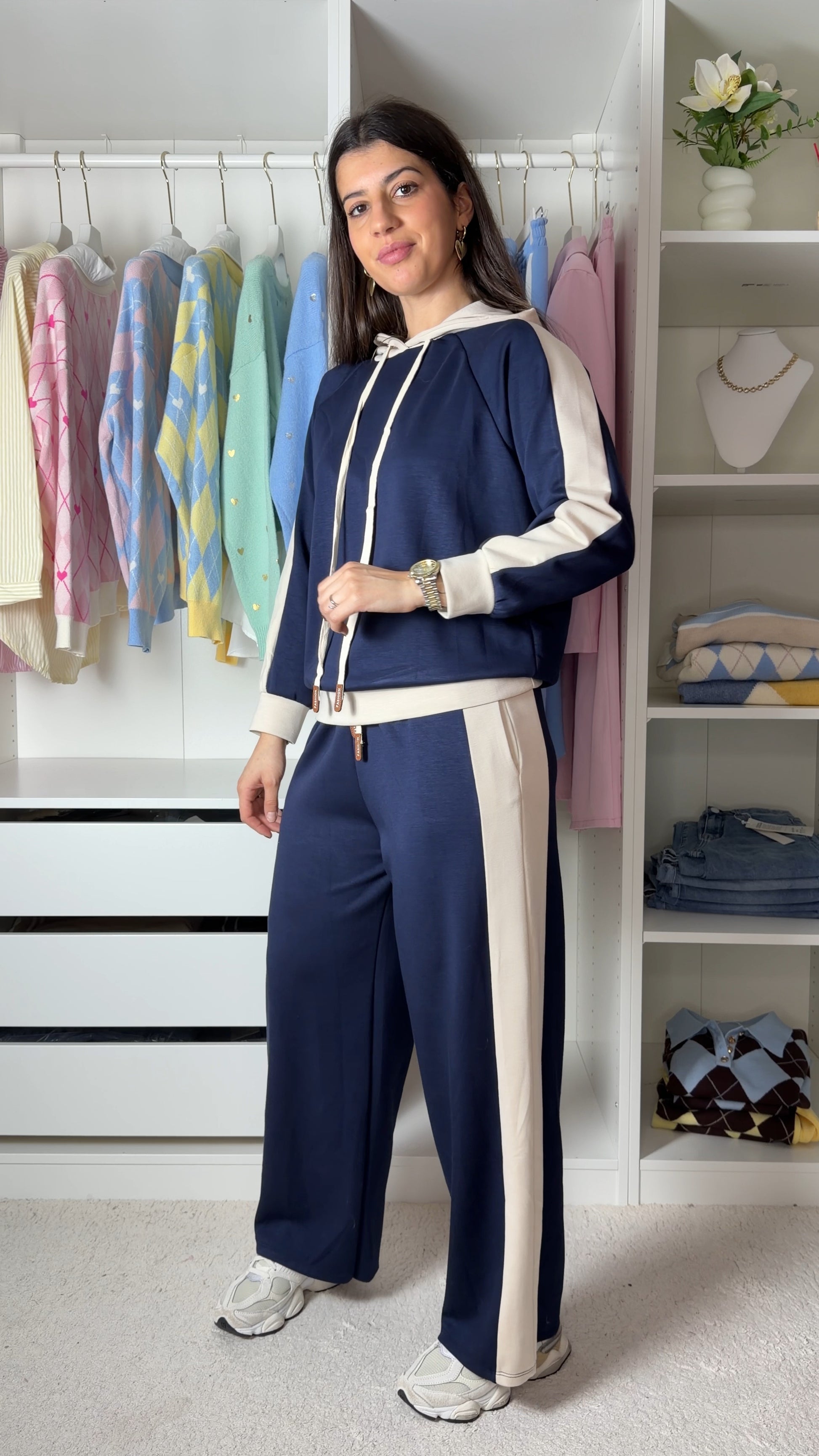 Conjunto fato de treino com pormenor de camisa as riscas