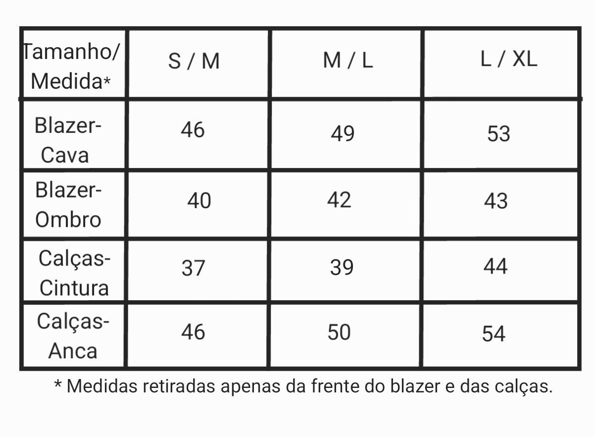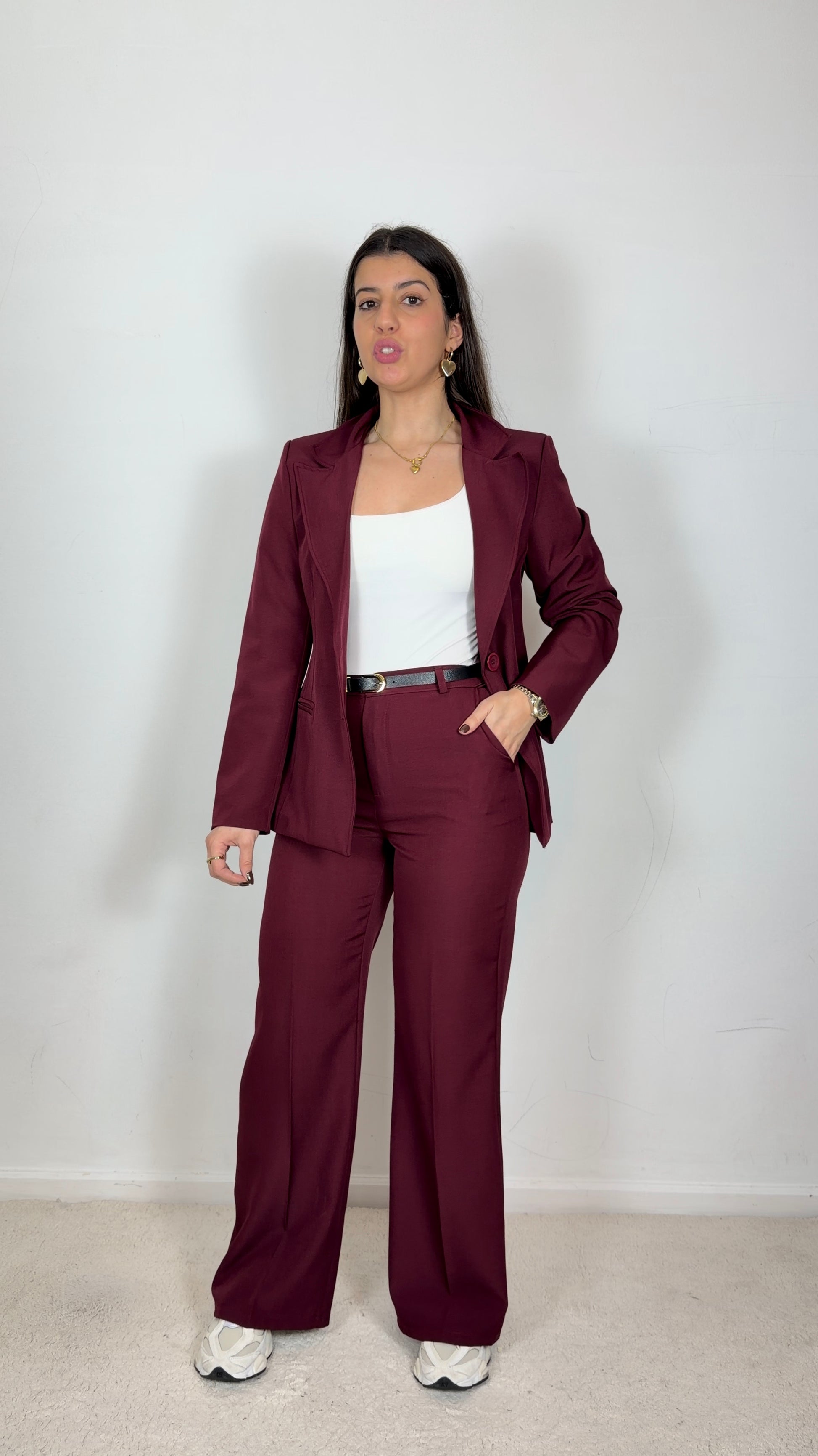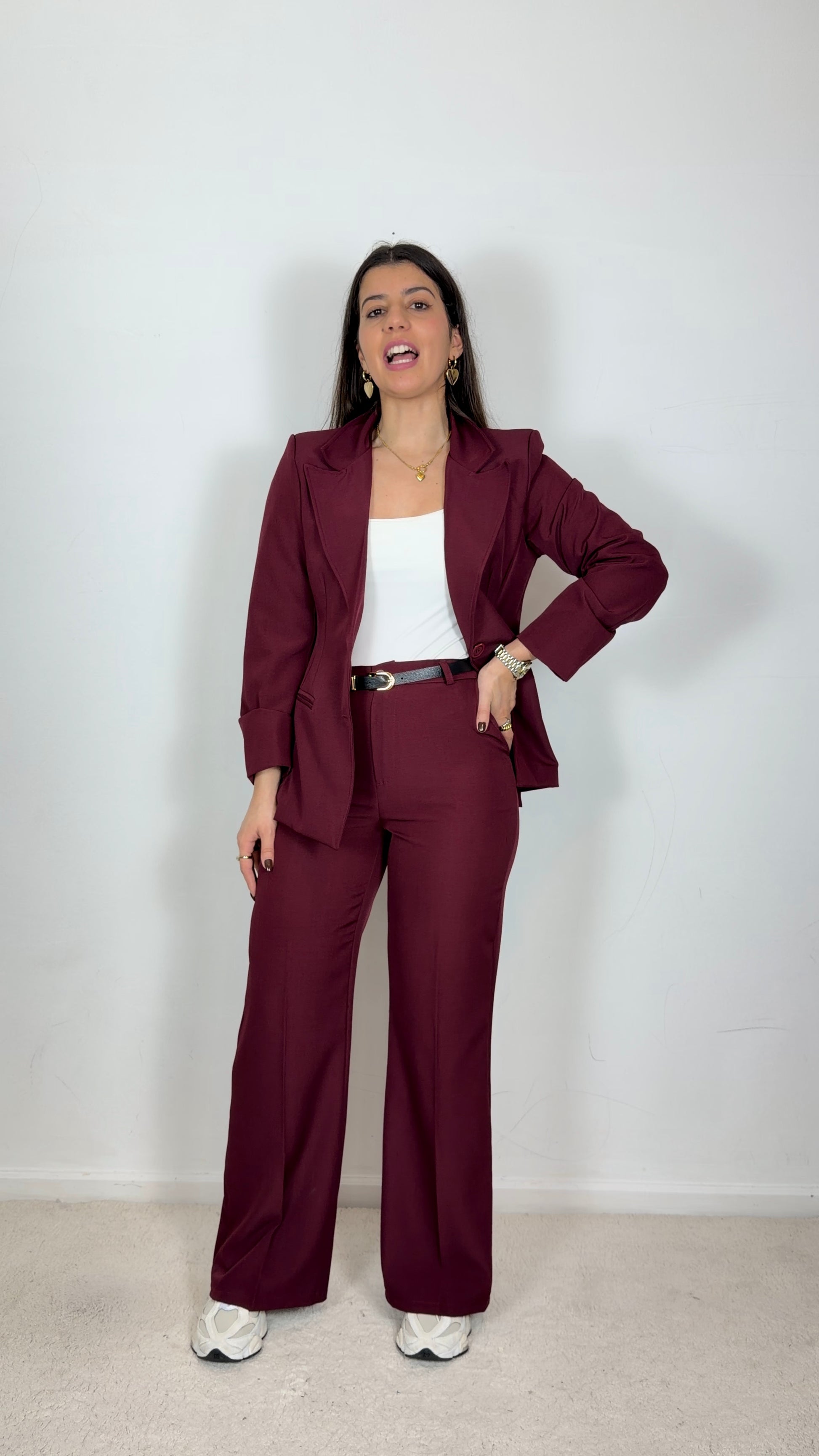 Fato elegante com blazer forrado e cintado , as calças são no estilo clássico wide leg , com cinto incluido . É um fato com elasticidade que se adapta bem ao teu corpo . O corte do blazer é lindíssimo, tem ja um silhueta . As calças são compridinhas .