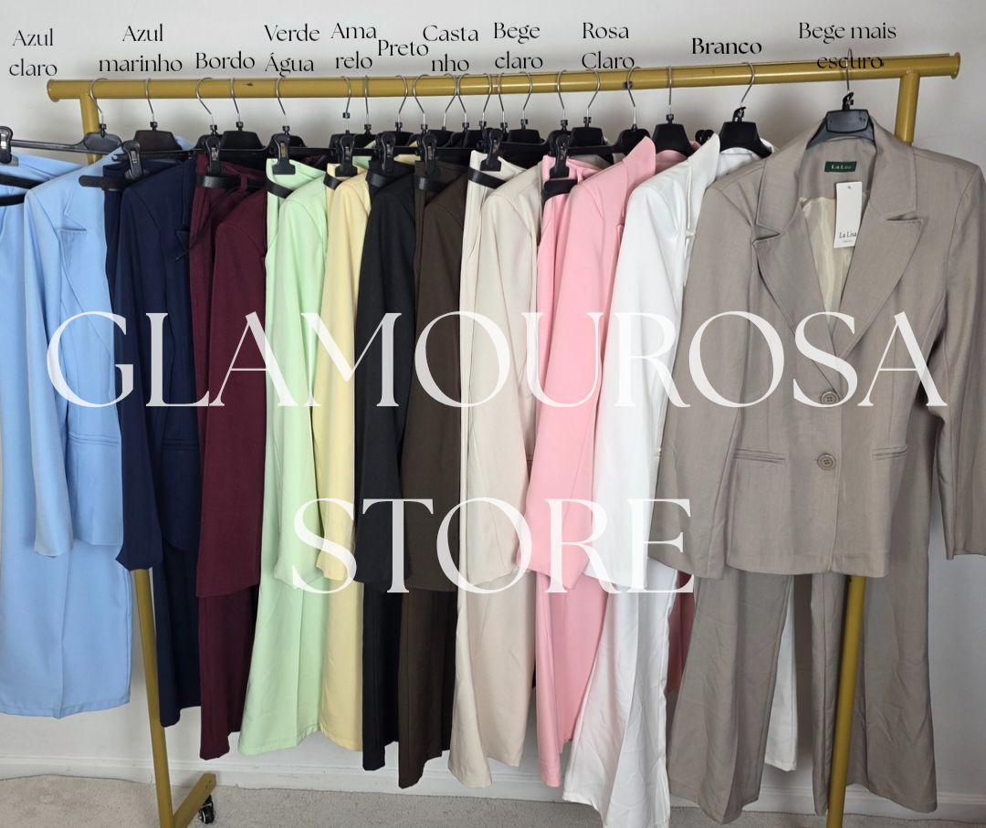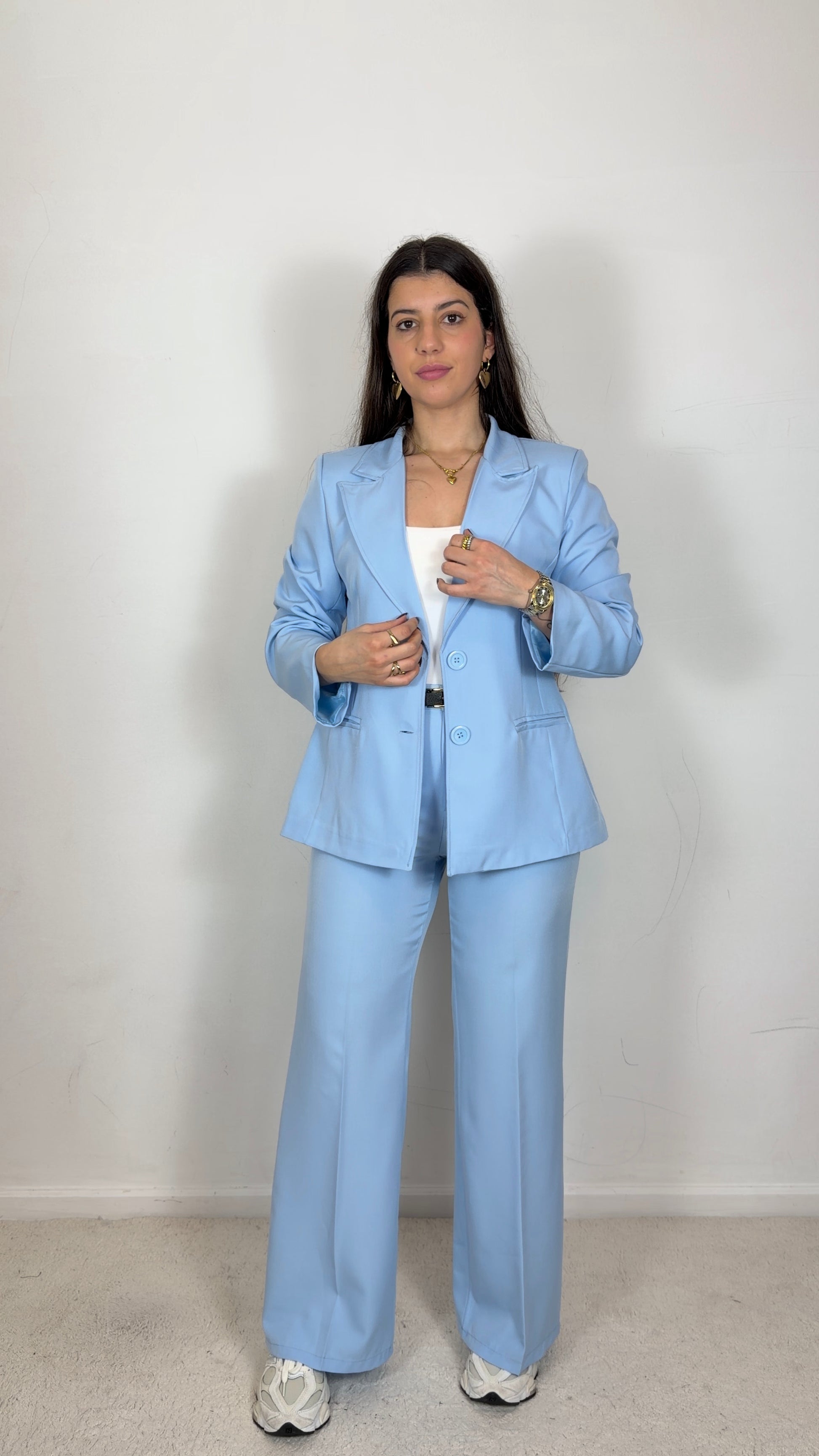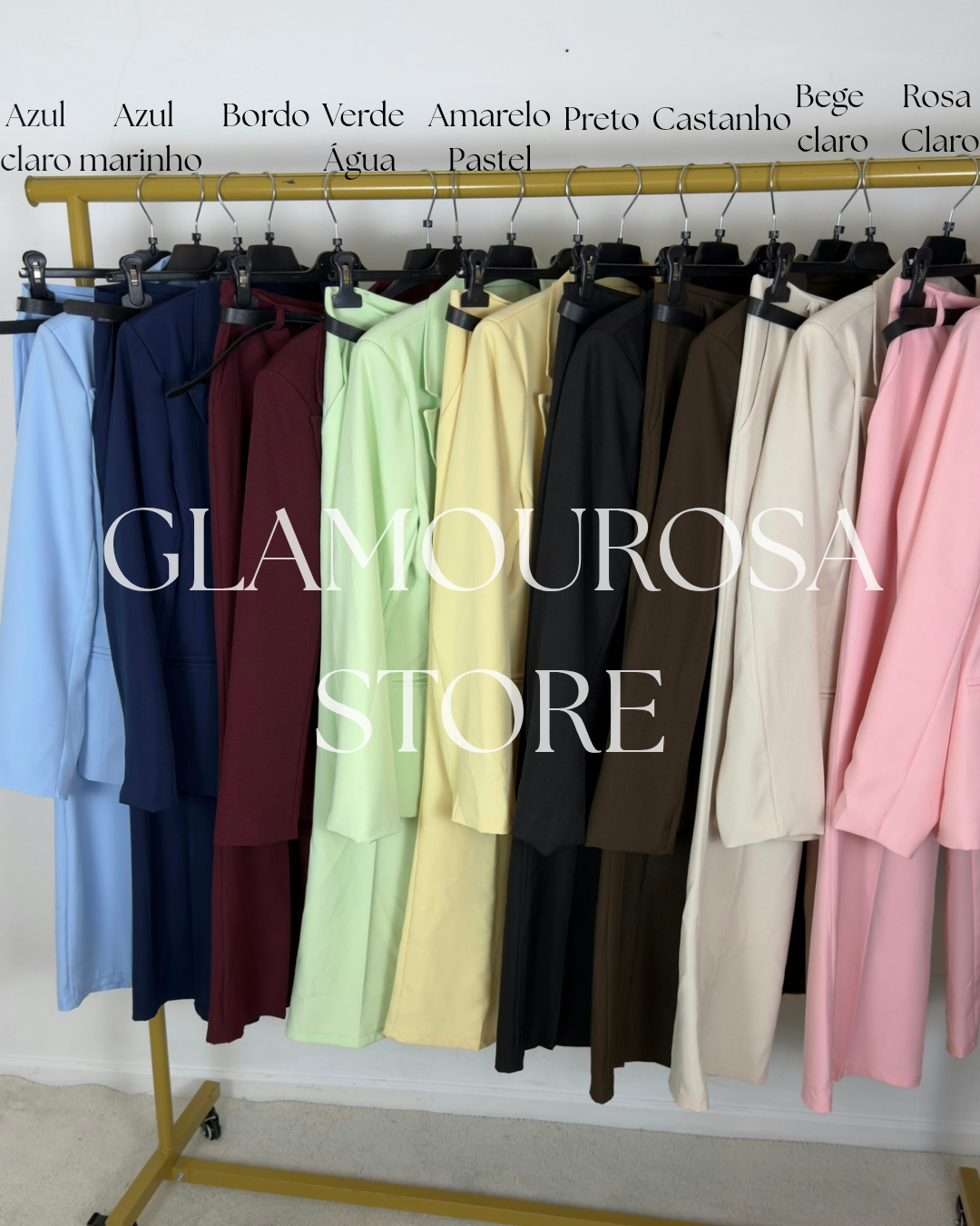 Fato elegante com blazer forrado e cintado , as calças são no estilo clássico wide leg , com cinto incluido . É um fato com elasticidade que se adapta bem ao teu corpo . O corte do blazer é lindíssimo, tem ja um silhueta . As calças são compridinhas .